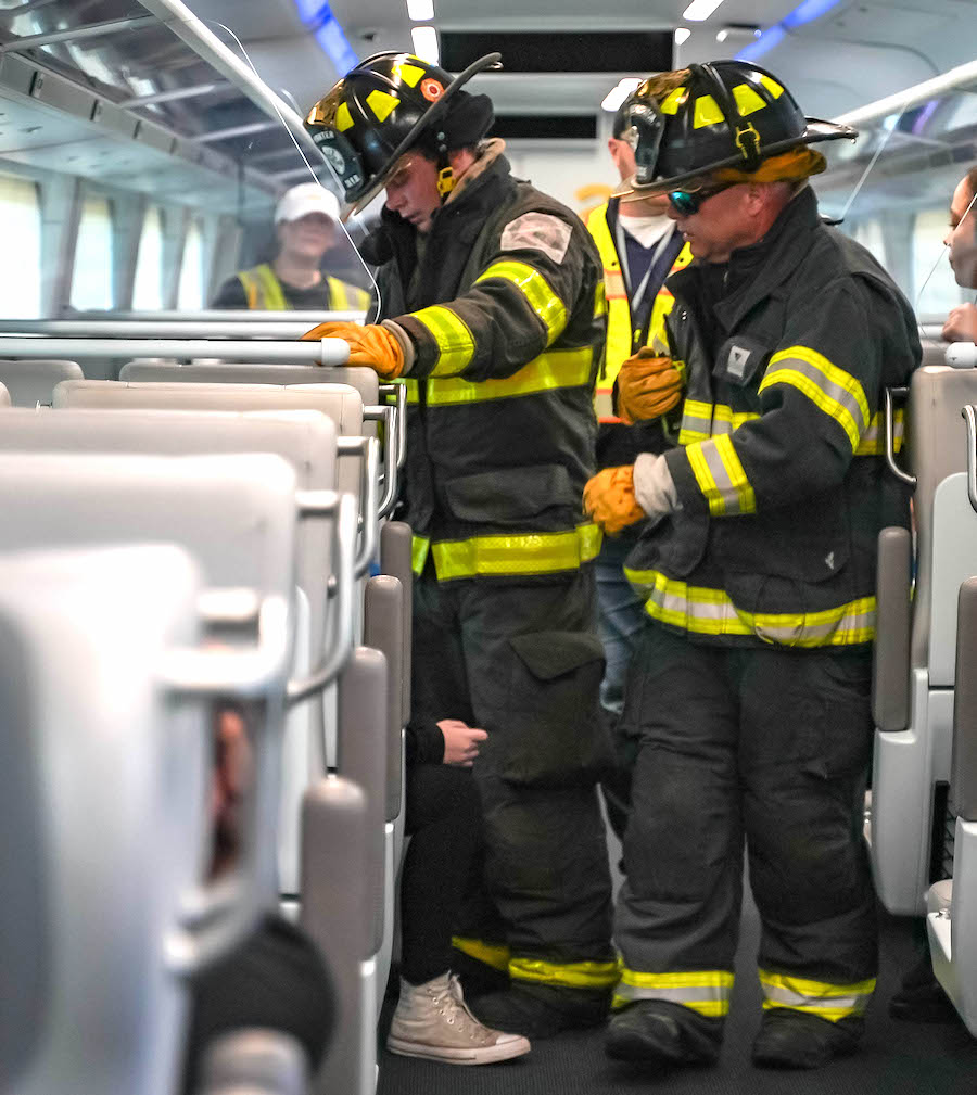 Actors with mock injuries helped first responders practice triage, patient assessment, and extraction techniques, while a staged vehicle on a nearby embankment recreated a potential roadway-rail incident. No trains were derailed or moved during the exercise.