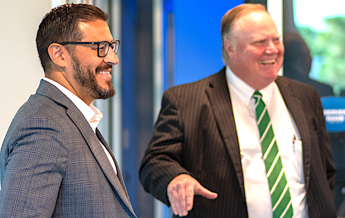 Eastern Florida State College President Dr. Jim Richey, right, welcomed Florida’s newly appointed Commissioner of Education, Anastasios “Stasi” Kamoutsas, on Tuesday as he began his statewide tour of state colleges and K-12 school districts.